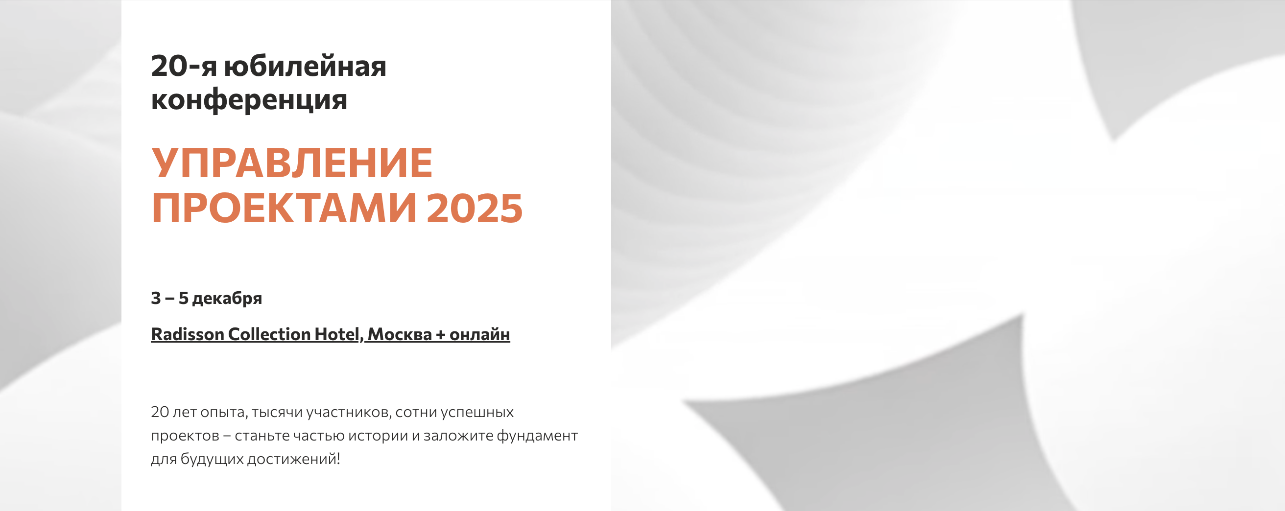 20-я юбилейная конференция «Управление проектами 2025» является обязательным событием для всех, кто стремится к профессиональному росту и внедрению инноваций в управлении проектами.